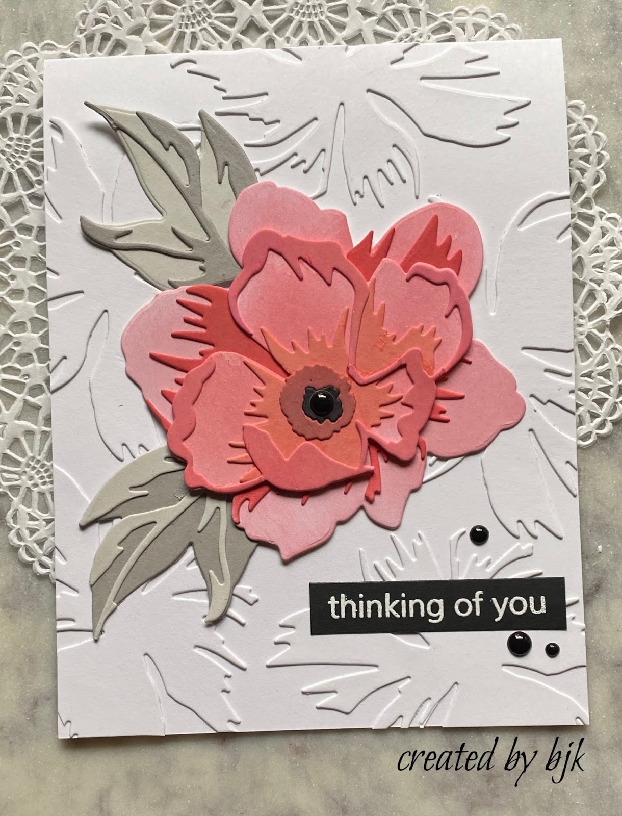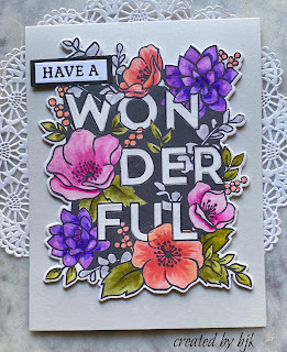 I watercolored Concord & 9th Wonderful Florals stamp in colors pretty close to the required ones - then die cut it. Added the little friend sentiment from the same stamp set. Used my black gel pen on the stamen of the flowers to set them off a bit. And ready to fly off to England.
